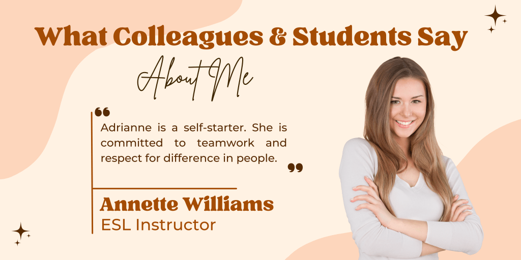 It is my pleasure to write about Adrianne. When we met first, my English was poor and it was hard to communicate. I could not speak what I thought in my mind, but she gave me some words/hints and tried to understand me.